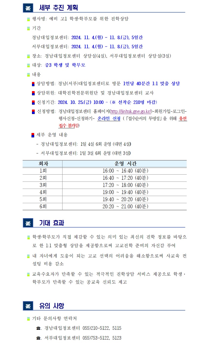 나. 일시 및 장소 - 2024. 11. 4.(월)~11. 8.(금), 5일간/경남대입정보센터 상담실(4실) - 2024. 11. 4.(월)~11. 8.(금), 5일간/서부대입정보센터 상담실(3실)