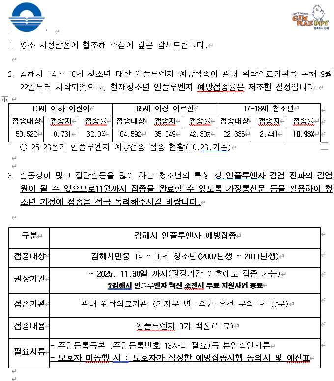 김해시 청소년 무료 인플루엔자 예방접종 협조 요청